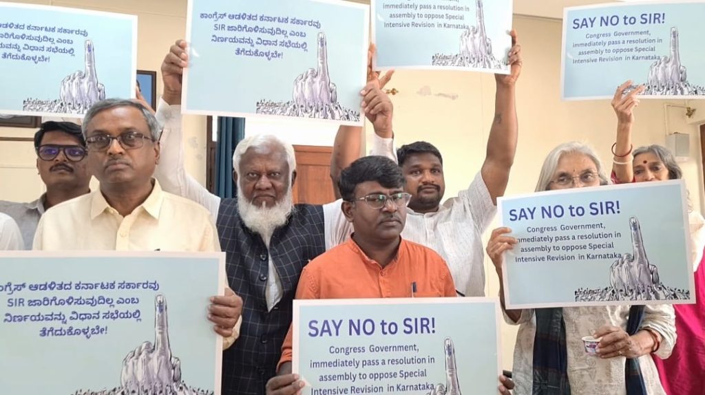 Speakers at the meeting warned that the SIR, being implemented in Karnataka for the first time, could lead to mass deletion of voter names and potential disenfranchisement of marginalized communities, including Dalits, Adivasis, Muslims, women, and migrant workers.