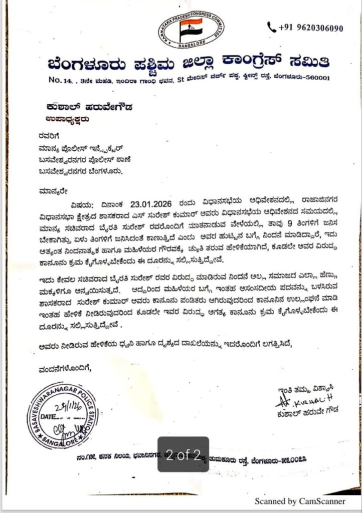 According to the complaint, Suresh Kumar, the Rajajinagar MLA, made an offensive comment about the birth of Women and Child Development Minister Byrathi Suresh while speaking to him on the floor of the House. The remark, which allegedly suggested an abnormal birth, has been described by the Congress as “deeply insulting, unparliamentary and an affront to the dignity of women.”